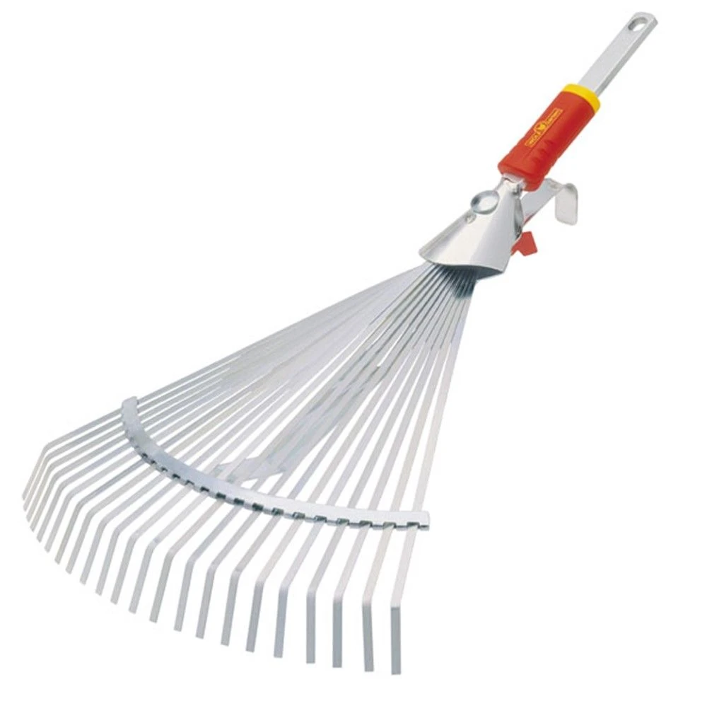 WOLF-Garten verstelbare bladhark met steel. Platte tanden, werk breedte tussen 36 – 58 cm. Steel lengte 144cm.